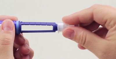 ➡️ 펜을 잡고 펜의 맨 뒤를 한 번 눌러서 주사 바늘 끝에서 방울이 약간 맺히는지 확인합니다.