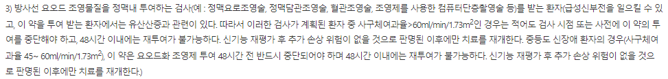혈관조영술 등 방사선 요오드 조영물질을 정맥 내로 투여하는 시술을 받게 되는 경우에는, 검진 3일전부터 메트포르민 복용을 반드시 중단해야 합니다. 또한 검사 이후에도 최소 2일이 지난 후부터 다시 복용을 시작해야합니다. 이를 무시하고 복용을 하게 될 경우 유산산증과 관련하여 급성신부전 등 신장질환이 발생할 수 있으므로 반드시 주의사항을 지켜야합니다.