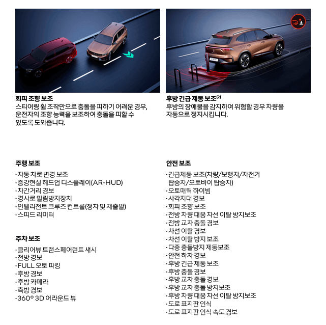 - 긴급 제동 보조 (차량/보행자/자전거 탑승자/오토바이 탑승자/교차로 대향차)