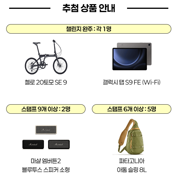 | 챌린지 완주 | 첼로 20토모 SE 9 / 갤럭시 탭 S9 FE | 각 1명 |